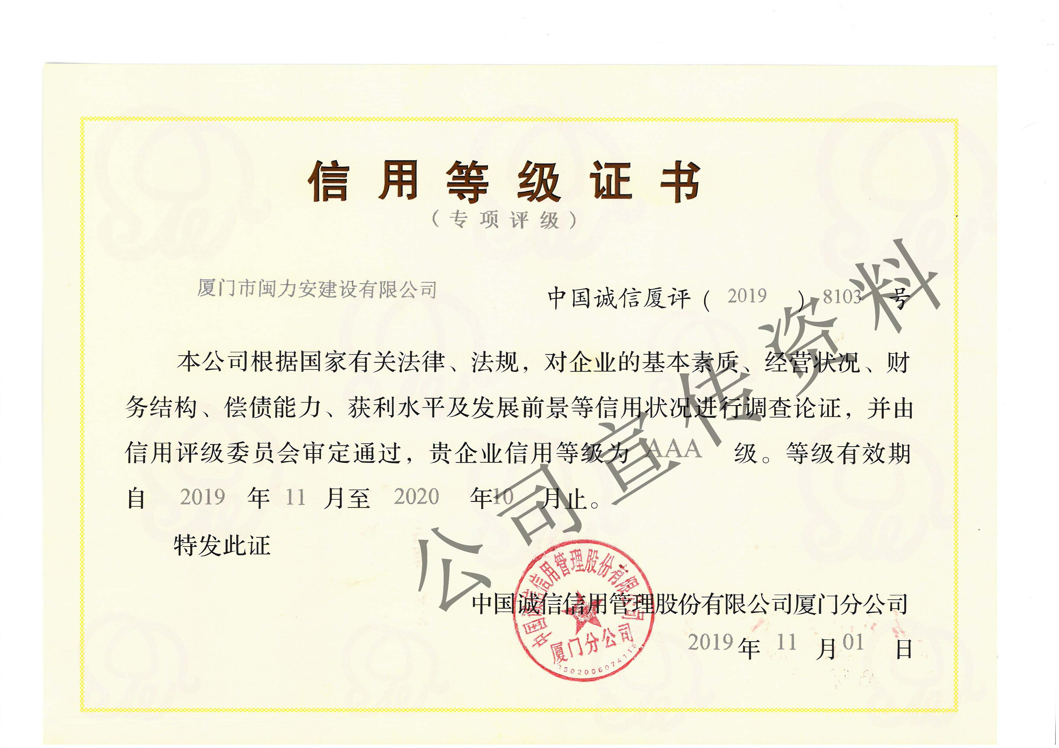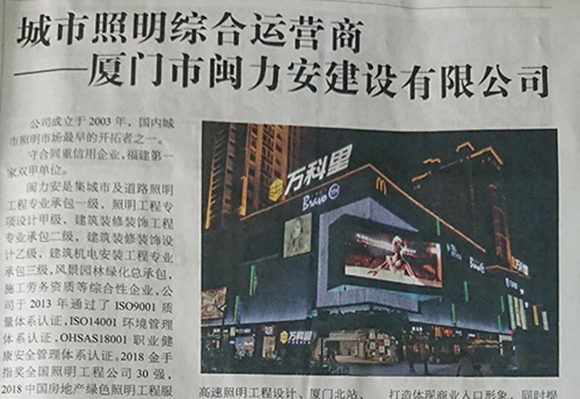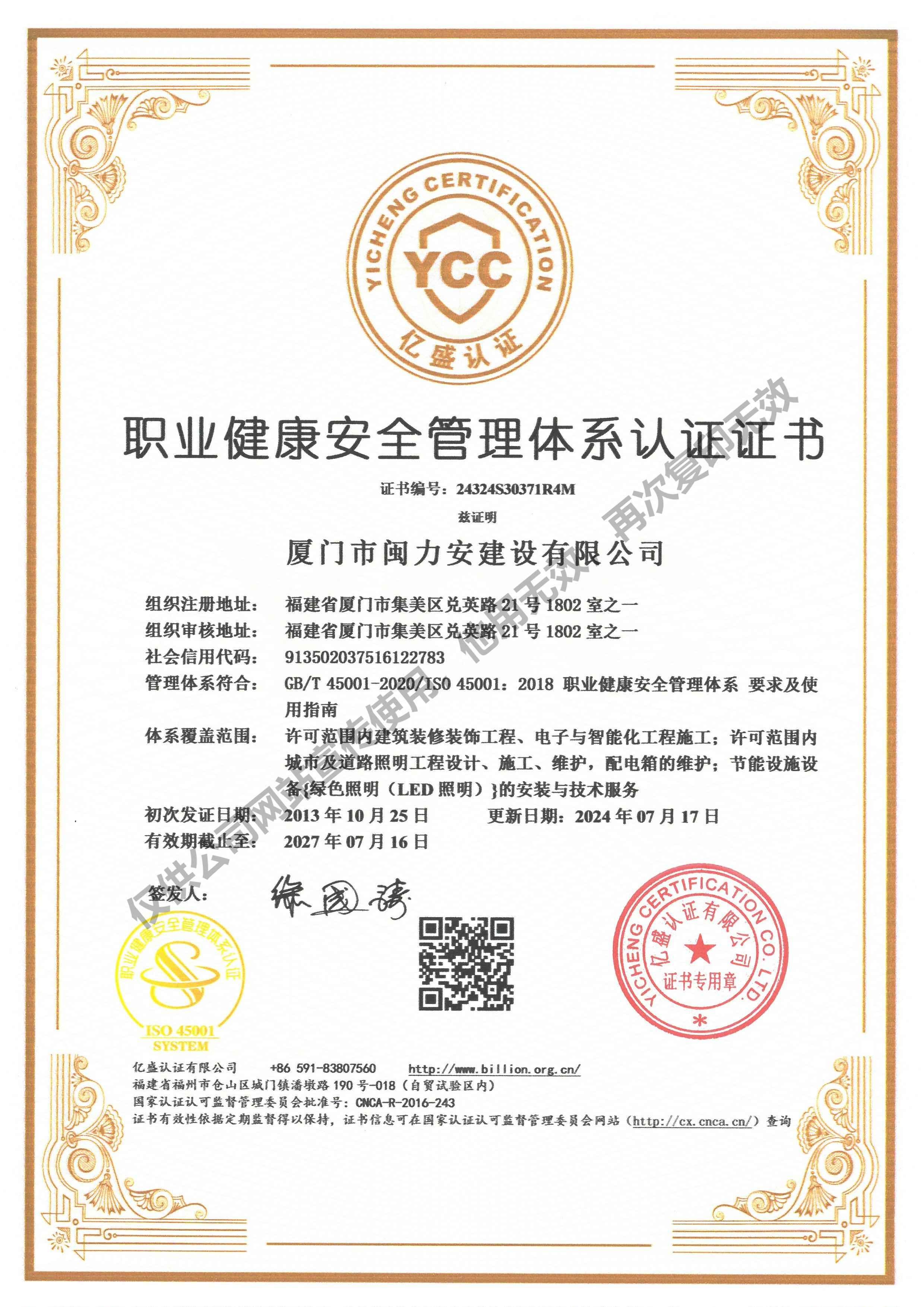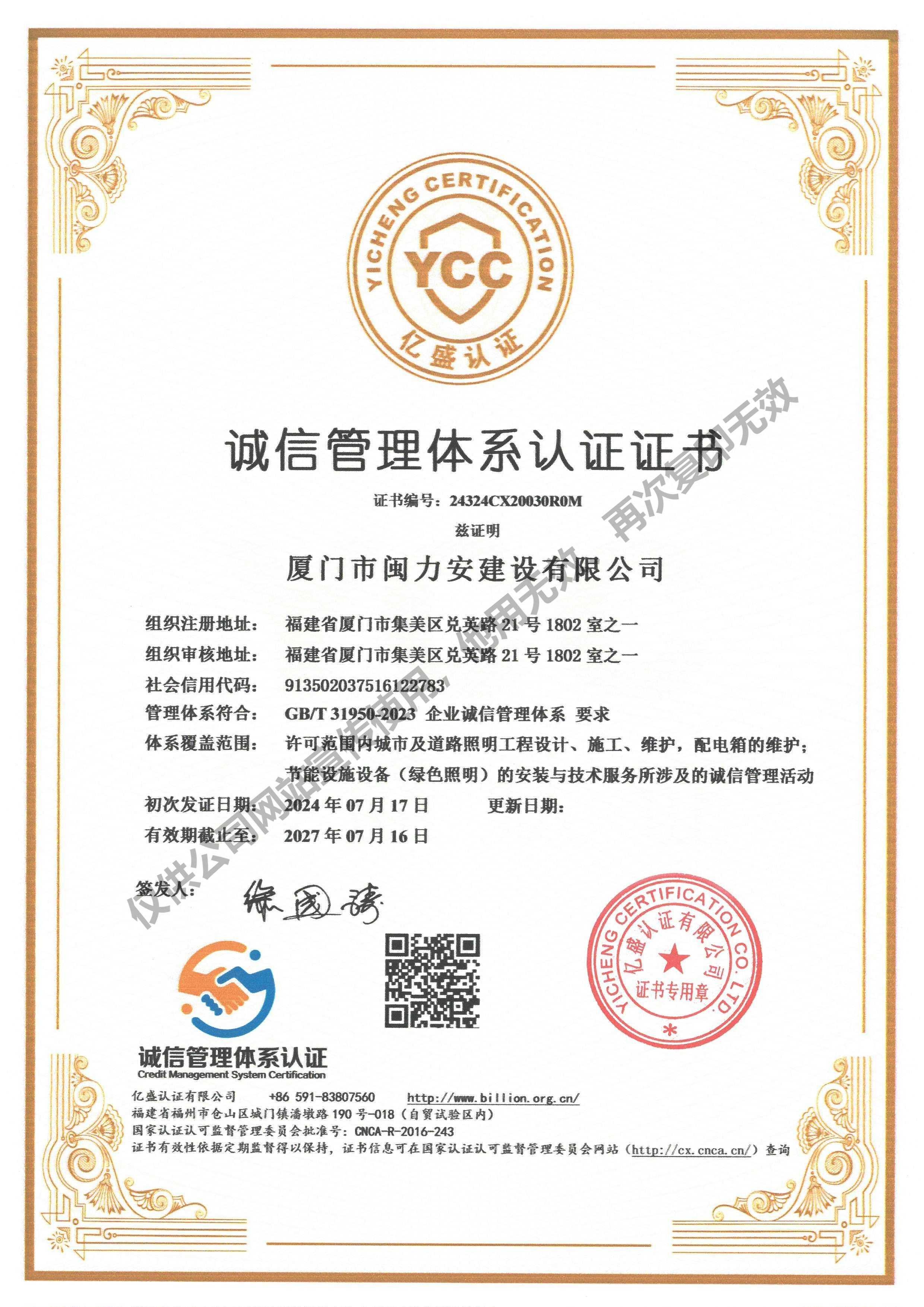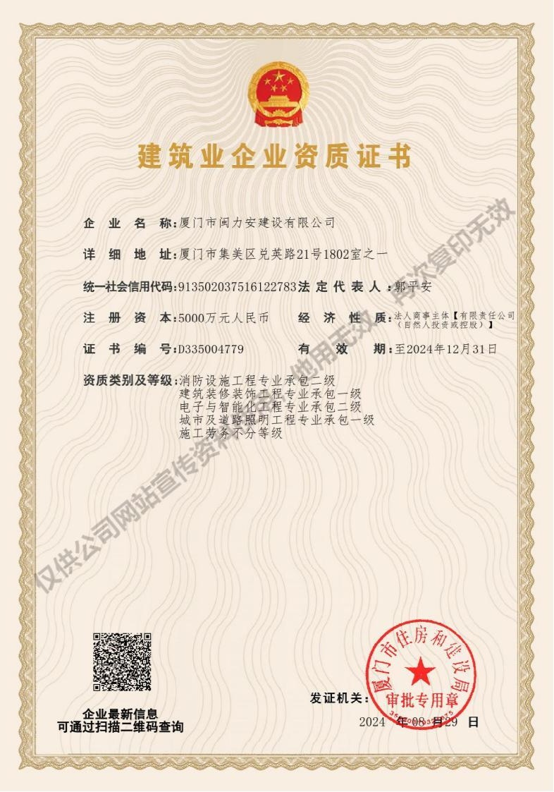廈門市閩力安建設有限公司成立于2003年,公司取得市政公用工程施工總承包貳級、建筑裝修裝飾工程專業(yè)承包壹級、城市及道路照明工程專業(yè)承包壹級、電子與智能化工程專業(yè)承包貳級、消防設施工程專業(yè)承包貳級、電力工程施工總承包叁級、建筑機電安裝工程專業(yè)承包叁級、輸變電工程專業(yè)承包叁級、環(huán)保工程專業(yè)承包叁級、照明工程設計專項甲級、建筑裝飾工程設計乙級、施工勞務等資質(zhì)的綜合型企業(yè),公司于2013年通過了ISO9001質(zhì)量體系認證,ISO14001環(huán)境管理體系認證,OHSAS18001職業(yè)健康安全管理體系認證。