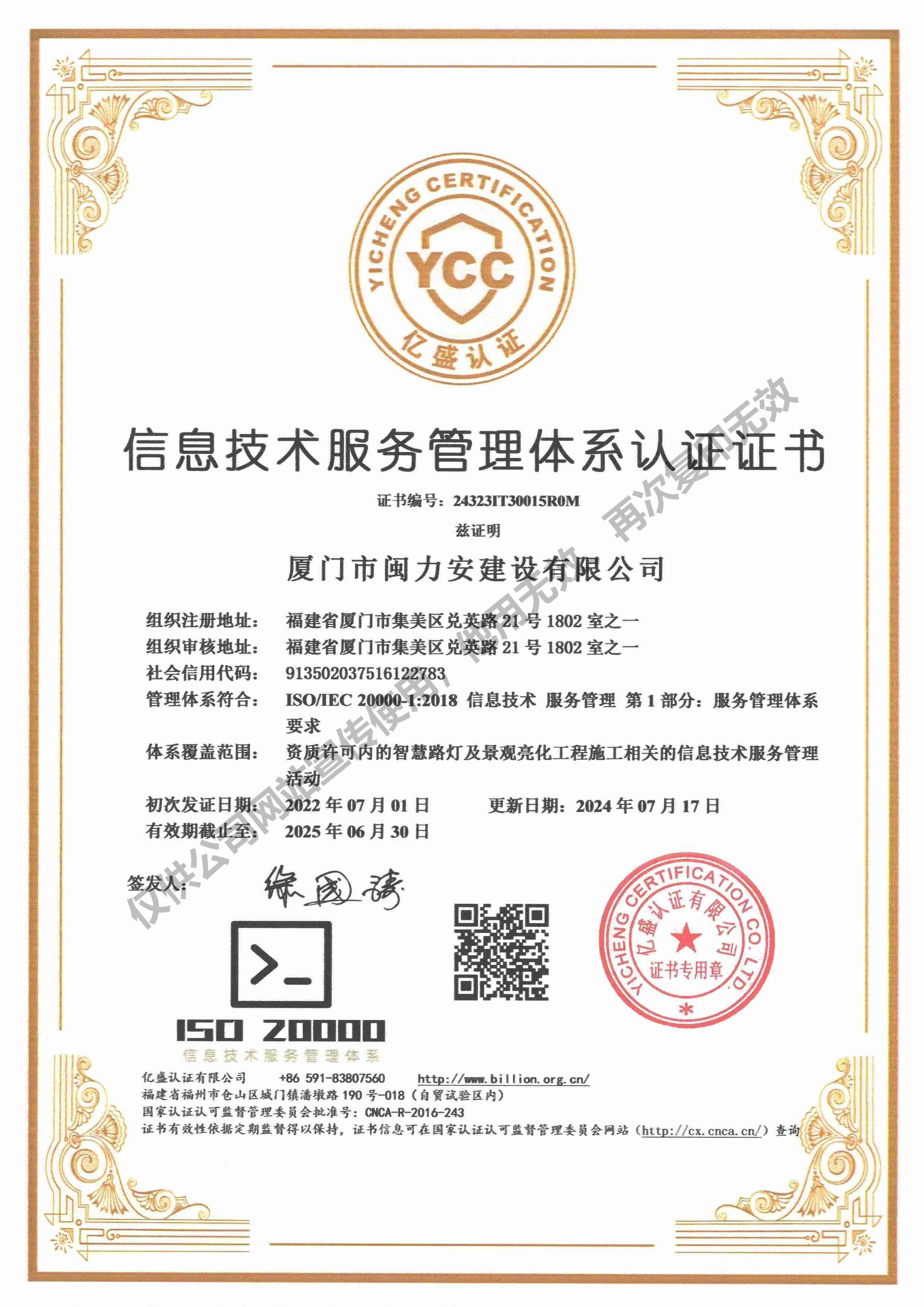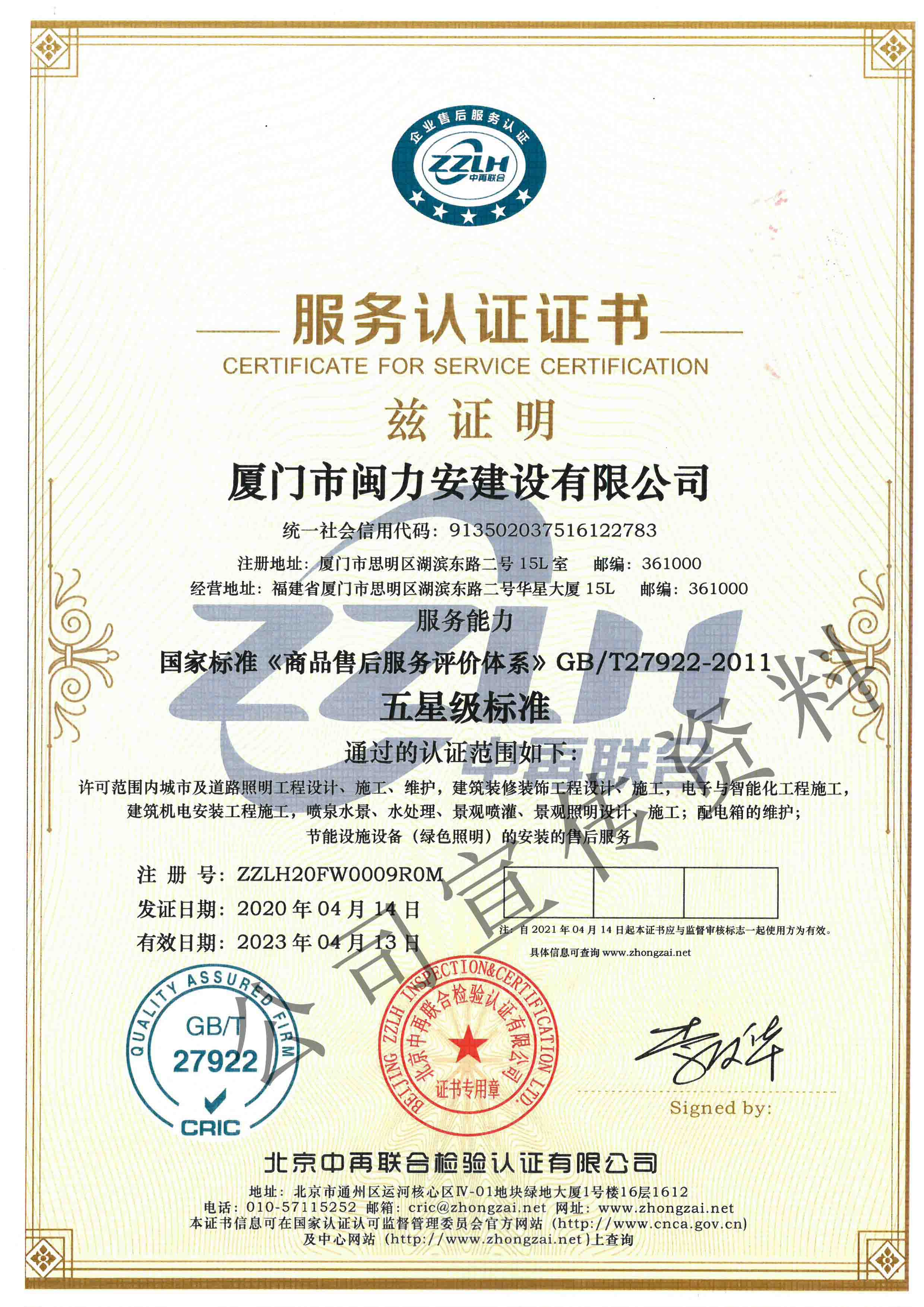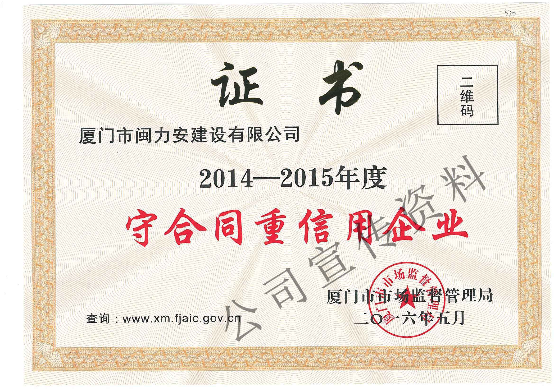 廈門市閩力安建設有限公司成立于2003年,公司取得市政公用工程施工總承包貳級、建筑裝修裝飾工程專業(yè)承包壹級、城市及道路照明工程專業(yè)承包壹級、電子與智能化工程專業(yè)承包貳級、消防設施工程專業(yè)承包貳級、電力工程施工總承包叁級、建筑機電安裝工程專業(yè)承包叁級、輸變電工程專業(yè)承包叁級、環(huán)保工程專業(yè)承包叁級、照明工程設計專項甲級、建筑裝飾工程設計乙級、施工勞務等資質(zhì)的綜合型企業(yè),公司于2013年通過了ISO9001質(zhì)量體系認證,ISO14001環(huán)境管理體系認證,OHSAS18001職業(yè)健康安全管理體系認證。
